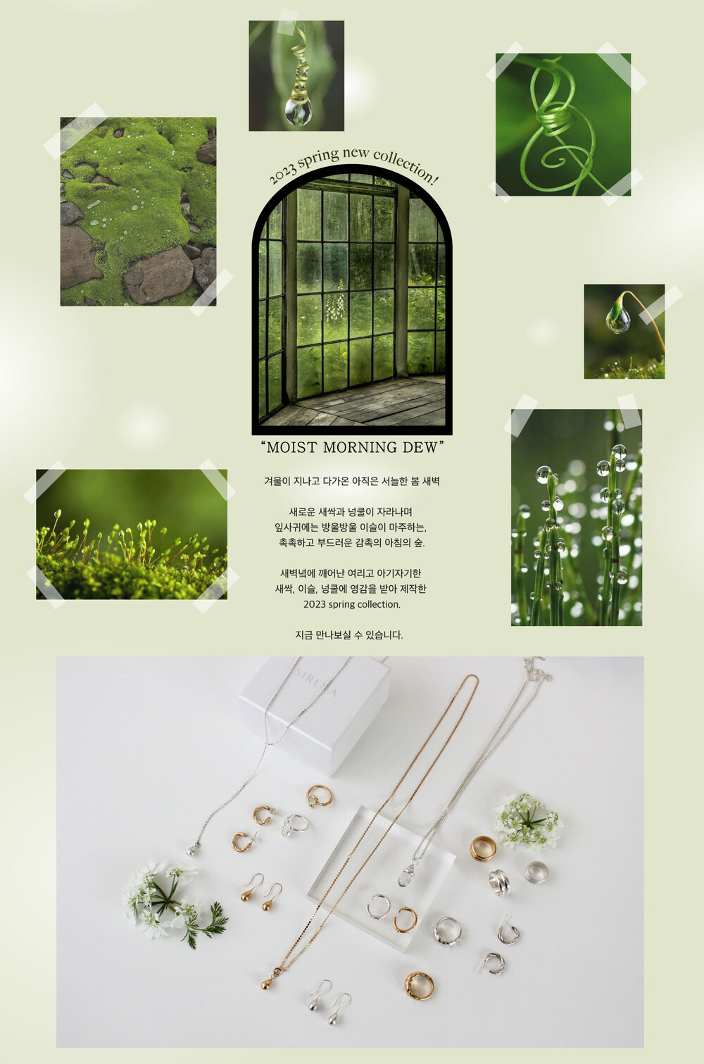 봄 새벽 잎사귀들에 맺혀있는 물방울을 떠올리며 제작한 드롭 네크리스입니다.